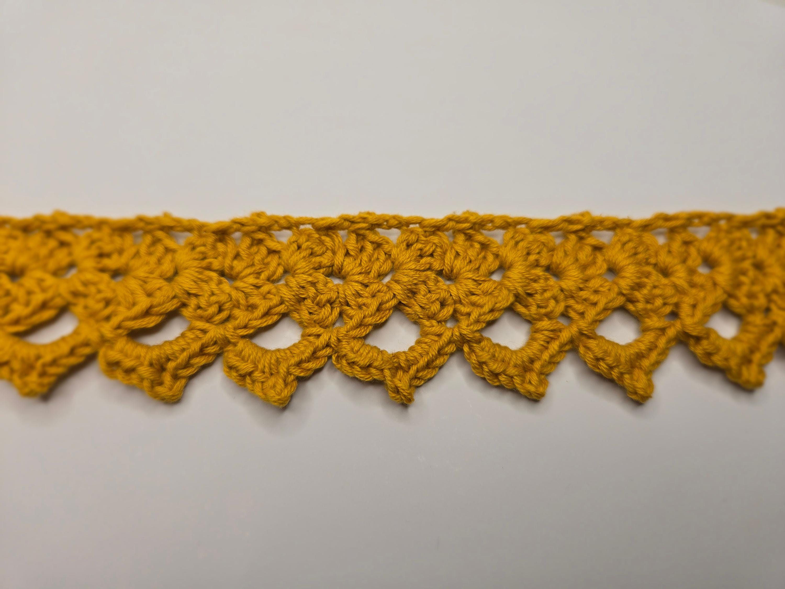 Create a beautiful, timeless lace edging with this crochet lace border pattern. Designed with a delicate scalloped look, this lace is perfect for adding a handmade touch to tablecloths, shelves, towels, runners, blankets, and other home decor projects.